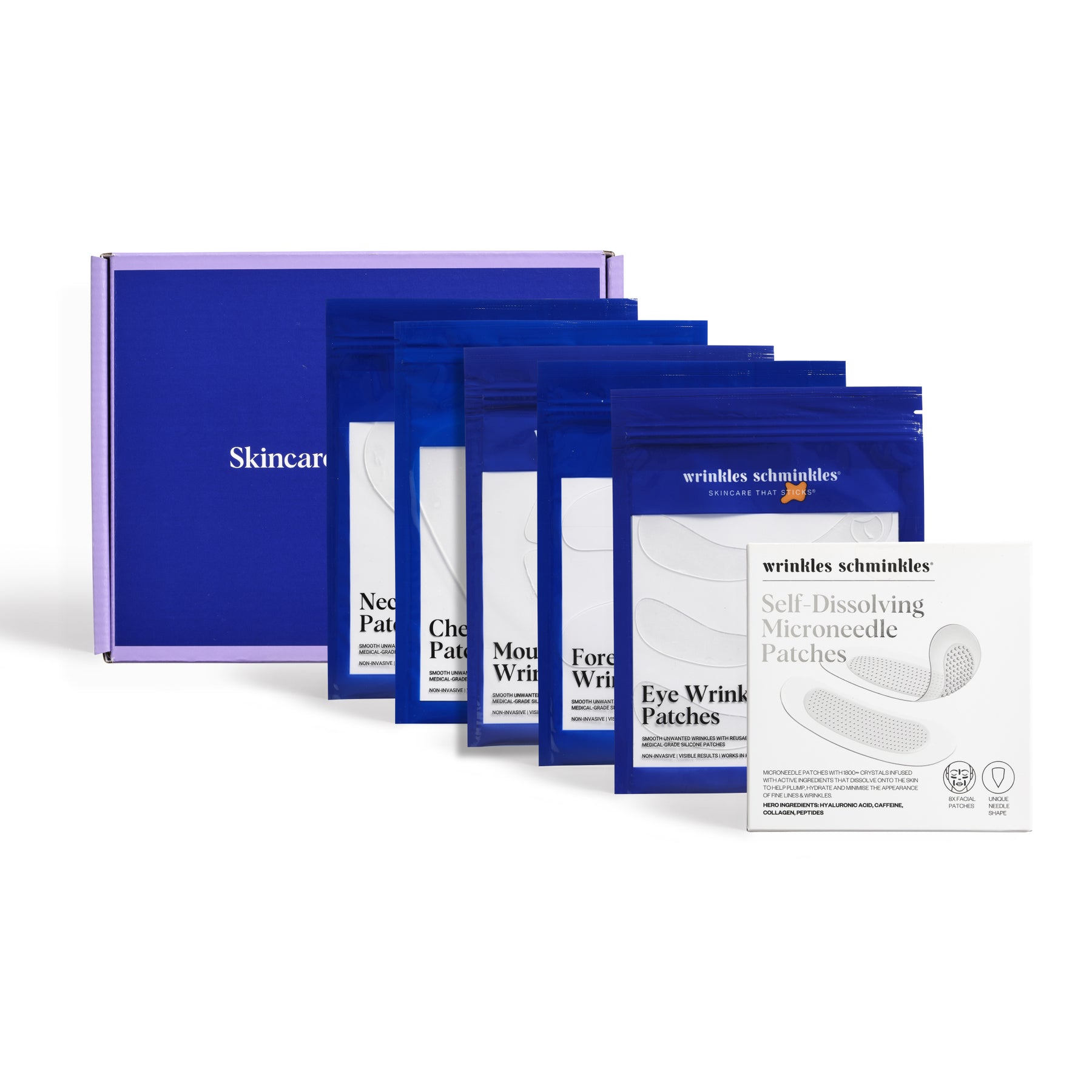 This gift set is designed to target wrinkles and fine lines under your eyes, around your mouth and on your forehead, chest and neck caused by ageing, sun damage, and side-sleeping with our 100% Medical-Grade Silicone and Self-Dissolving Microneedle Patches that sit comfortably on your face while you sleep (or multi-task), rehydrating, smoothing and refining the skin.